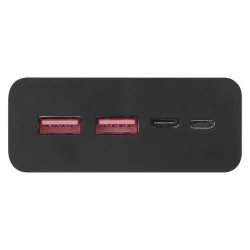 Czarny powerbank o pojemności 20000 mAh firmy Emos z cyfrowym wyświetlaczem. Power bank z serii BETAQ 20 wyposażony został w ogniwa litowo-polimerowe. Pojemność powerbanku 20000 mAh wystarczy, aby naładować 8 krotnie telefon. Niewielkie rozmiary, oraz niska waga, sprawiają że akumulator zmieści się do kieszeni, torebki lub plecaka w bagażu podręcznym. Power bank z wyświetlaczem posiada liczne zabezpieczenia, chroniące ładowane urządzenia, jak i sam akumulator. Model posiada szybkie ładowanie oraz czytelny wyświetlacz wskazujący poziom naładowania. Waga powerbanku to 409g, a jego wymiary to 28x68x143mm.
