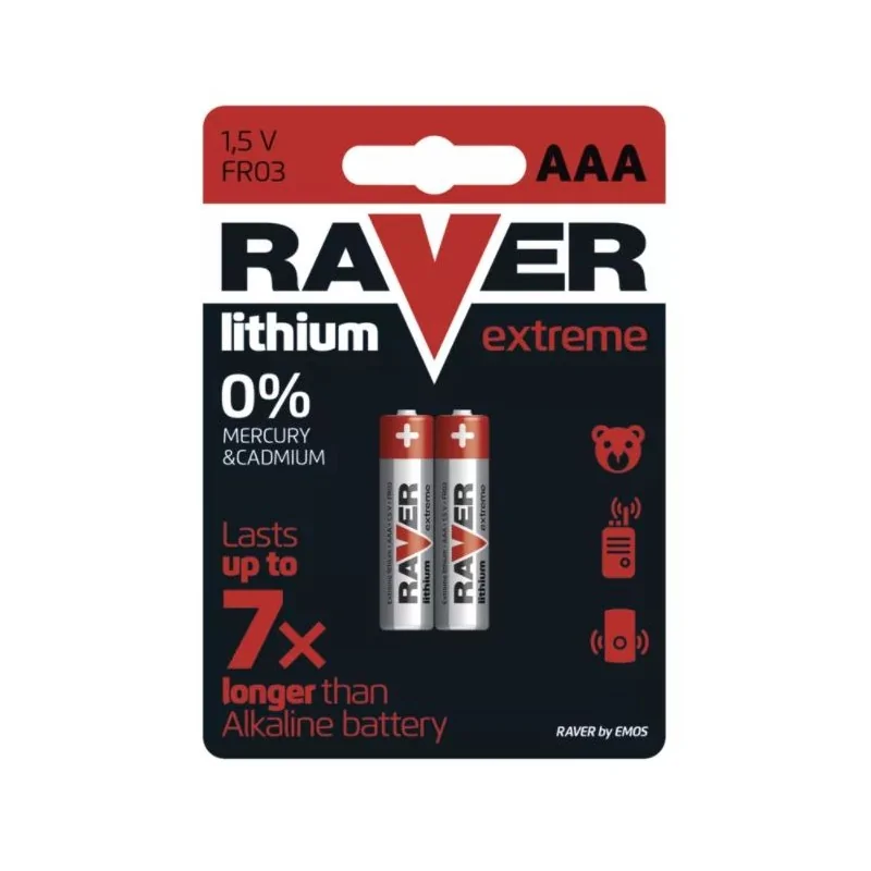 Blister 2 sztuki baterii litowych AAA Raver Emos. Baterie małe paluszki litowe R03, charakteryzują się bardzo dużą wytrzymałością na skrajne temperatury. Zastosowane w bateriach ogniwa litowe, mogą pracować w temperaturach od -40 °C do +60 °C. Dzięki tym właściwościom są chętnie wykorzystywane, w sprzęcie medycznym lub ratowniczym.