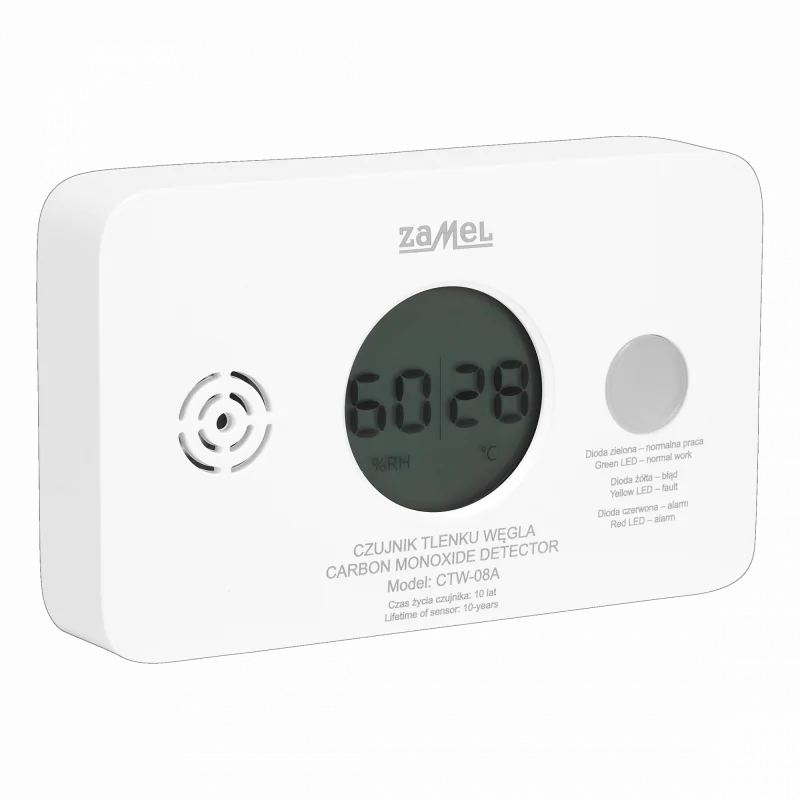 - Czytelny wyświetlacz LCD: Aktualne stężenie CO, temperatura i wilgotność powietrza.