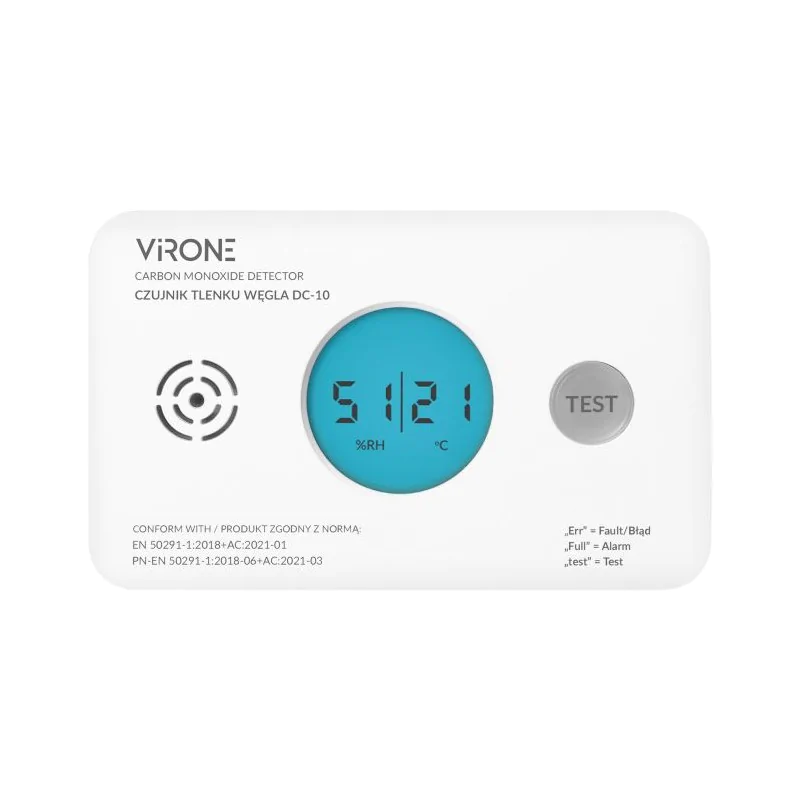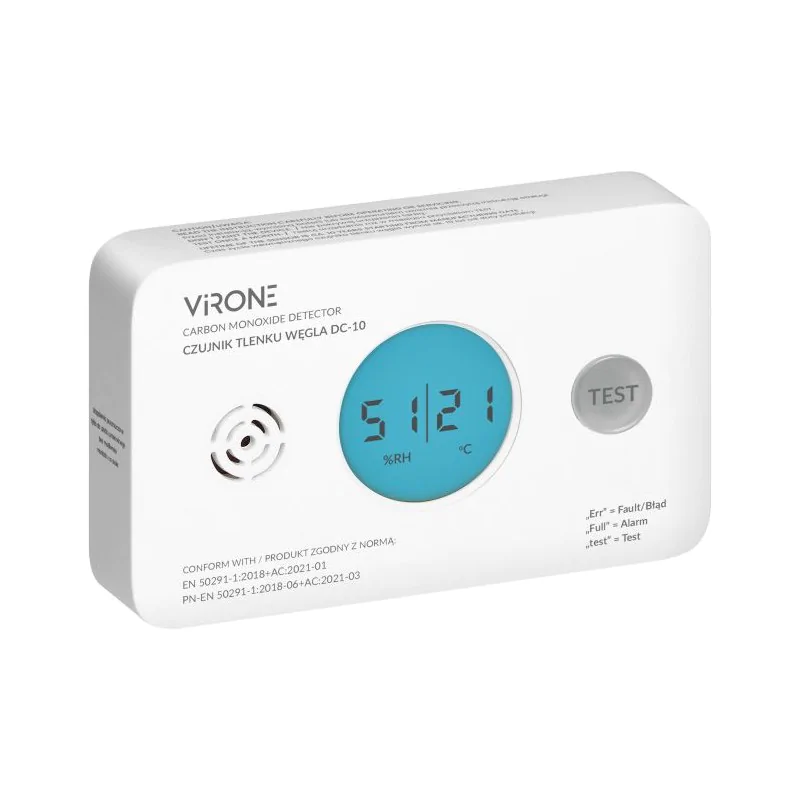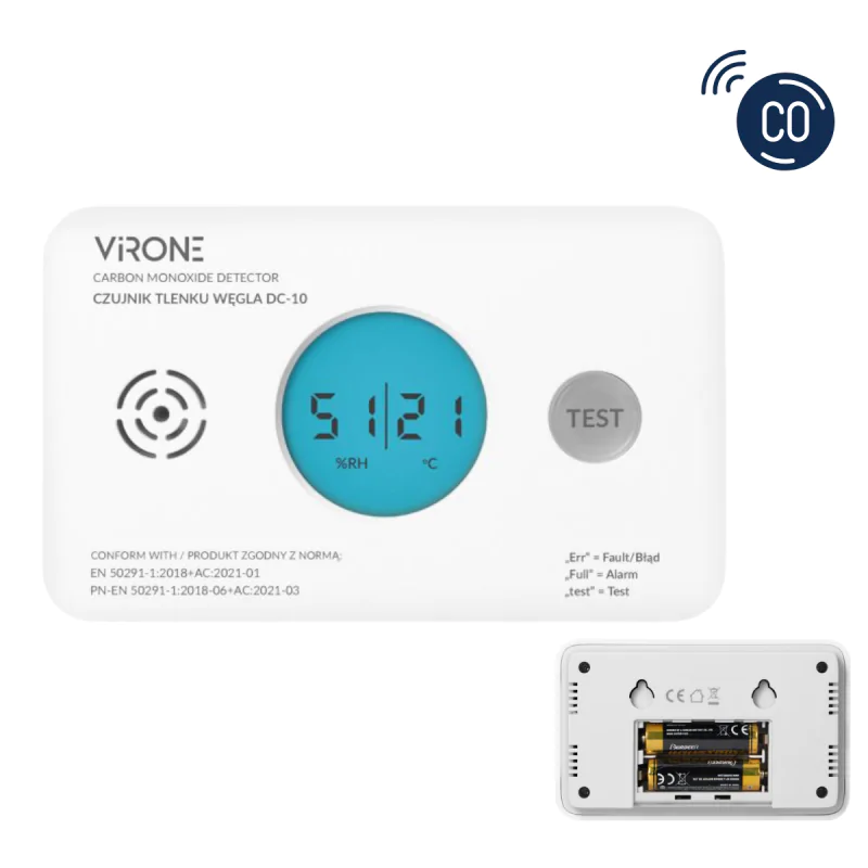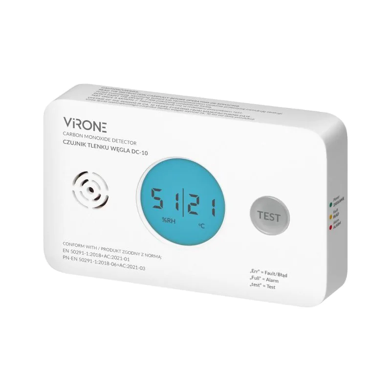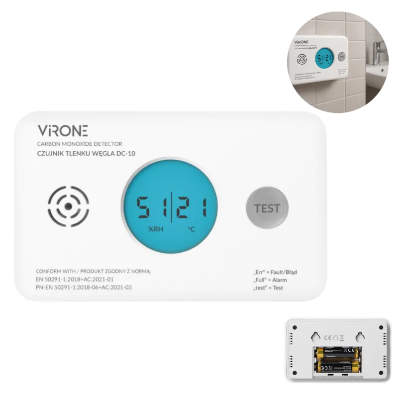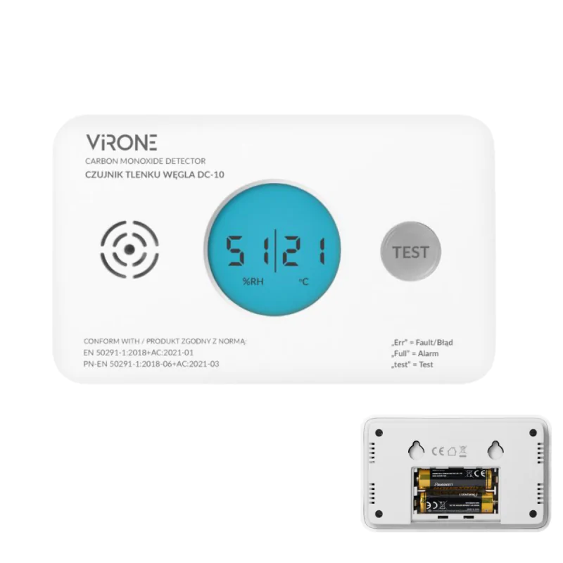 - Czytelny wyświetlacz LCD – pokazuje poziom czadu, stan baterii, temperaturę i wilgotność, co zwiększa funkcjonalność urządzenia.