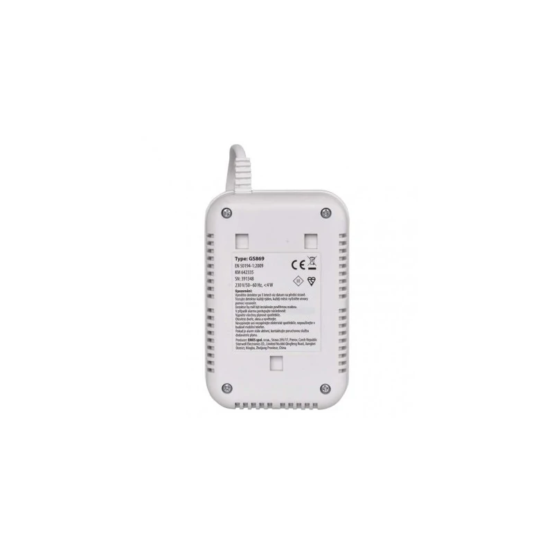 Detektor gazu GS869 służy do wykrywania wypływu gazów łatwopalnych (gaz ziemny, metan, propan, butan). Wykrywacz gazu GS869 da Ci pewność, że Twojemu domowi i Twoim bliskim nie grozi bezpośrednie niebezpieczeństwo związane z wyciekiem gazu ziemnego, metanu, propanu czy butanu. Detektor gazu GS869 ochroni Cię przed ryzykiem wybuchu i późniejszego pożaru przez pełne 5 lat. Model posiada sygnalizację akustyczną i optyczną oraz funkcję TEST. Wykrywacz gazu podpinany jest do wykłej instalacji 230V. Urządzenie dostosowuje się w ciągu 3 minut i jest w pełni gotowe do pracy. Przez następne 5 lat nie musisz się martwić o regularną wymianę baterii, jak to ma miejsce w przypadku innych typów detektorów. Detektor gazu jest przeznaczony do montażu na ścianie ( płytka montażowa w zestawie) lub do umieszczenia w dowolnym miejscu pomieszczenia. Model spełnia wszelkie normy bezpieczeństwa.