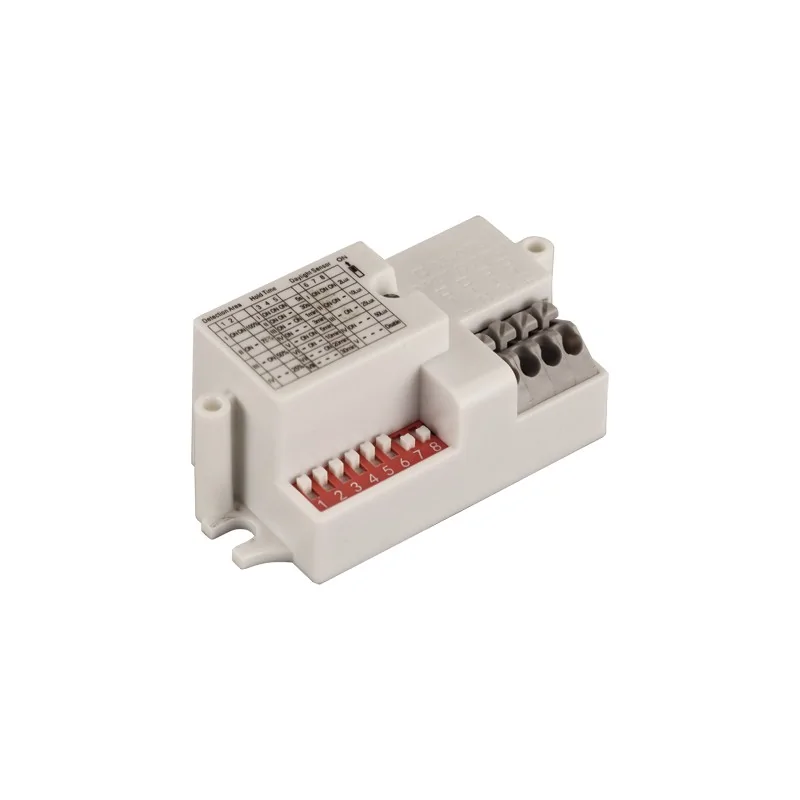 Mikrofalowy czujnik ruchu NEO MVS DIP marki IDEUS wykrywa ruch z odległości max 1 m, 2 m, 3 m, 4 m (do wyboru). Parametry takie jak czas świecenia czy jasność otoczenia, przy której czujnik działa, ustawia się nie przy pomocy pokręteł, lecz przy użyciu przełączników DIP Switch. Możliwe jest zatem precyzyjne zaprogramowanie czasu świecenia wynoszące 5 s, 30 s, 1 min, 3 min, 5 min, 10 min, 20 min, 30 min oraz jasności otoczenia, poniżej której czujnik będzie pracował, wynoszącej <2 lux, 10 lux, 25 lux, 50 lux oraz OFF, kiedy to czujnik działa bez względu na jasność otoczenia. Kąt działania czujnika to 150°/360°. Produkt przeznaczony jest do stosowania we wnętrzach pomieszczeń.