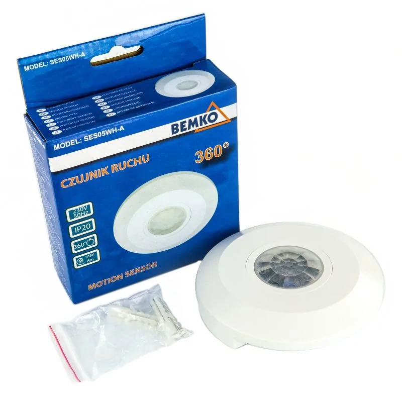 Biały czujnik ruchu SES05WH-A BEMKO to bardzo czułe urządzenie, wykrywające nawet niewielki ruch. Dzięki swoim małym rozmiarom nie będzie zajmować dużo miejsca. Biały czujnik firmy Bemko o polu detekcji 360 stopni gwarantuje szeroki zakres pracy.. Czujnik ruchu działa z maksymalną mocą urządzeń do 800W. Zasięg detekcji czujnika ruchu wynosi 6m max. (<24 st.C.). Czujnik ruchu SES05WH-A posiada stopień ochronności IP20 i zasilanie 230V. Czujnik ruchu to doskonałe urządzenie, które jest przydatne w każdym domu, biurze czy sklepie. Kolor czujnika ruchu jest uniwersalny, wpasowany do każdej przestrzeni.Czujnik ruchu wykonano z wysokiej jakości materiału, gwarantującego długotrwałe użytkowanie.