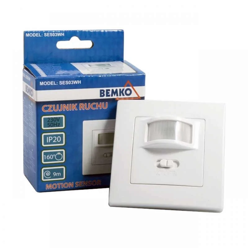 Czujnik ruchu SES03WH BEMKO przeznaczony do montażu w puszcze elektrycznej o przekroju 60 mm przystosowany jest do współpracy ze źródłami światła LED. Czujka ruchu nadaje się do instalacji na wysokości 1 - 1.8 metra. Wyłącznik podtynkowy z czujnikiem ruchu i zmierzchu wyposażony został w detektor podczerwieni i układ scalony. Wbudowany czujnik zmierzchowy pozwala na dostosowanie pracy urządzenia do wymagań użytkownika. Urządzenie charakteryzuje się wysoką czułością na ruch wdłużny. Czujnik posiada możliwość płynnej regulacji czasu załączenia. W proponowanym modelu pole detekcji wynosi 160 stopni, a zasięg działania to 9 metrów. Sprzęt pracuje w 3 trybach: on, off oraz pir. Dzięki niemu mamy możliwość łatwego automatycznie załączania obwodów elektrycznych, czyli rozwiązania gwarantującego oszczędność dla naszego portfela.