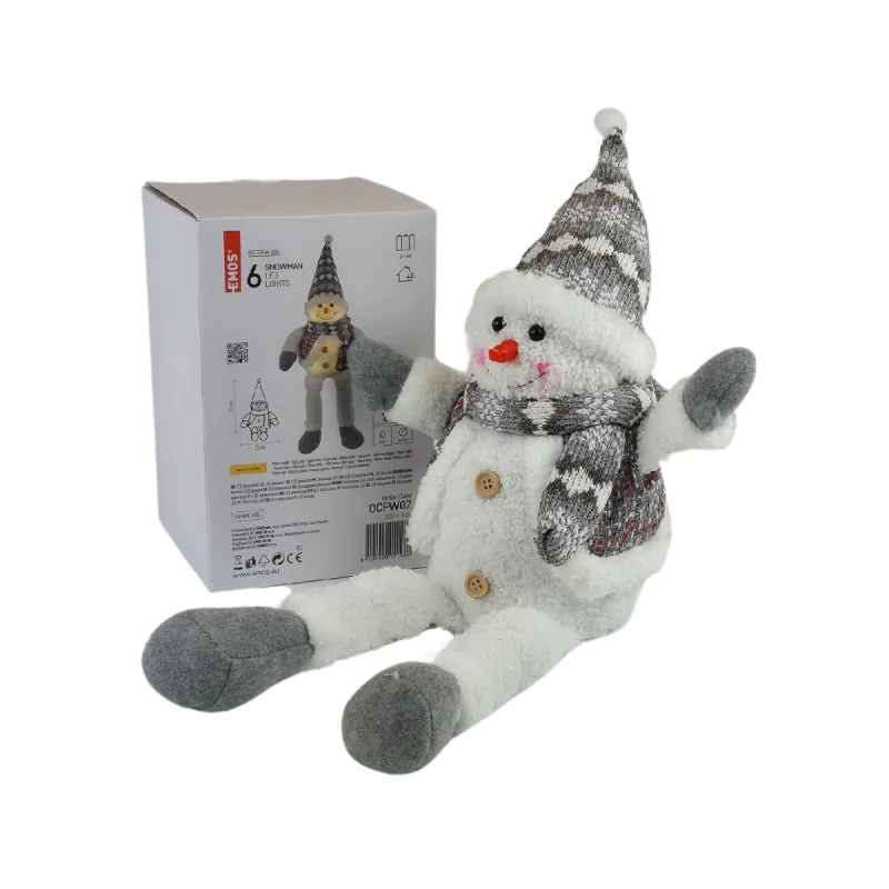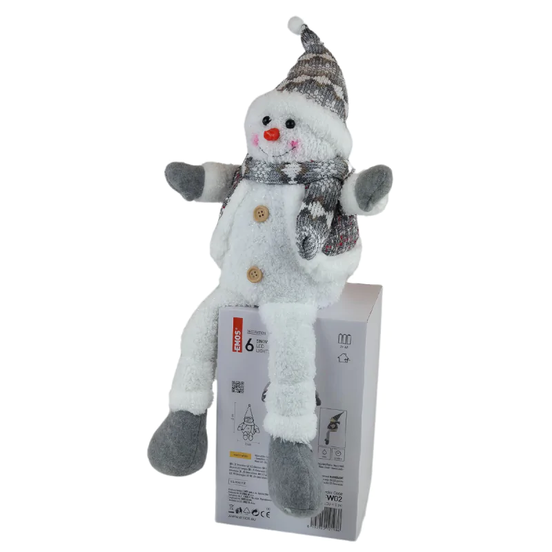 Dekoracja świąteczna w postaci uroczego bałwanka w czapce to prawdziwa ozdoba pokoju idealna na świąteczny czas. Dekoracja na Boże Narodzeni marki EMOS dedykowana jest do użytku w pomieszczeniach, a jej wymiary to: 21x12x31cm. Wbudowane LED-y - 6 diod świecą delikatnym ciepłym światłem dodając uroku figurce bałtwanka świątecznego. Model zasilany jest 3 bateriami AA - brak w zestawie. Szaro-biały kolor ozdoby Bożonarodzeniowej pasuje do wielu modnych wnętrz.