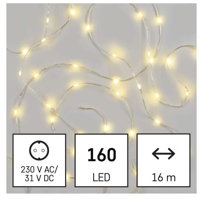 Łańcuchy świąteczne D3AW16 NANO marki EMOS, złoty to oczywisty wybór do tworzenia przytulnej atmosfery przy różnych świątecznych okazjach, gdzie nie chcesz, aby ogólne wrażenie dekoracji. Ultra cienki drut można wygiąć do własnych preferencji, a lampki można owinąć wokół wieńca adwentowego lub ulubionej postaci na półce. Światełka zasilane są sieciowe i dla bezpieczeństwa wyposażone są w TIMER. Drucik świeci ciepłą barwą światła o delikatnym świetle 3,6W. Całość mierzy 16 metry. Drucik nadaje się zarówno do dekoracji pomieszczeń jak i obiektów na zewnątrz. Polecamy zapoznać się z całą rozbudowaną serią świąteczną marki EMOS