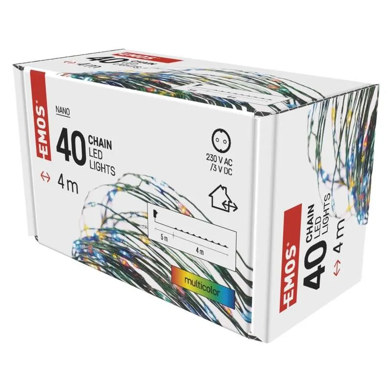 Dekoracja świecąca D3AM01, to cienki drucik, który posiada 40szt, wbudowanych diod LED, świecących na kolorowo. Jest to propozycja do ozdobienia stroików świątecznych lub jako dodatkowo oświetlenie choinkowe. Łańcuch marki EMOS mierzy 4m długości + 5m przewodu zasilającego. Światełka posiadają stopień odporności IP44, dlatego możemy zamontować łańcuszek w pomieszczeniu jak i i na zewnątrz. Oświetlenie wykonane jest z metalu i pobiera moc 2,4W. Dodatkowo ma wbudowany TIMER. Drucik dostępny jest o różnych długościach oraz barwie świecenia. Produkt objęty dwuletnią gwarancją producenta.