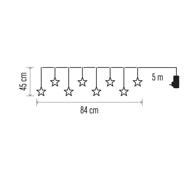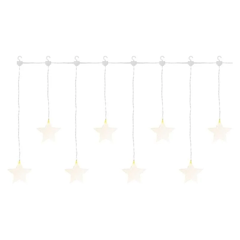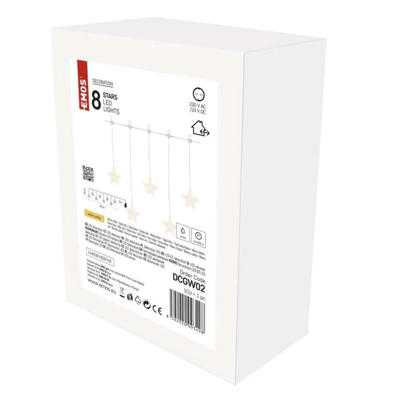 Świecące dekoracyjne gwiazdki LED DCGW02 marki EMOS, nadadzą się jako dodatkowa dekoracja Bożonarodzeniowa, którą możemy zamontować np. na oknie, zarówno w pomieszczeniu jak i na zewnątrz. Szerokość to 84cm oraz długości 45cm, dodatkowo łańcuch wyposażony jest w zasilacz o długości 5m. Świecących gwiazdek LED jest 8szt, emitują ciepłą barwą i pobierają 0,6W mocy. Dla bezpieczeństwa i komfortu girlanda posiada wbudowany TIMER. Światełka dostępne są w różnych kształtach. Produkt objęty jest gwarancją producenta.