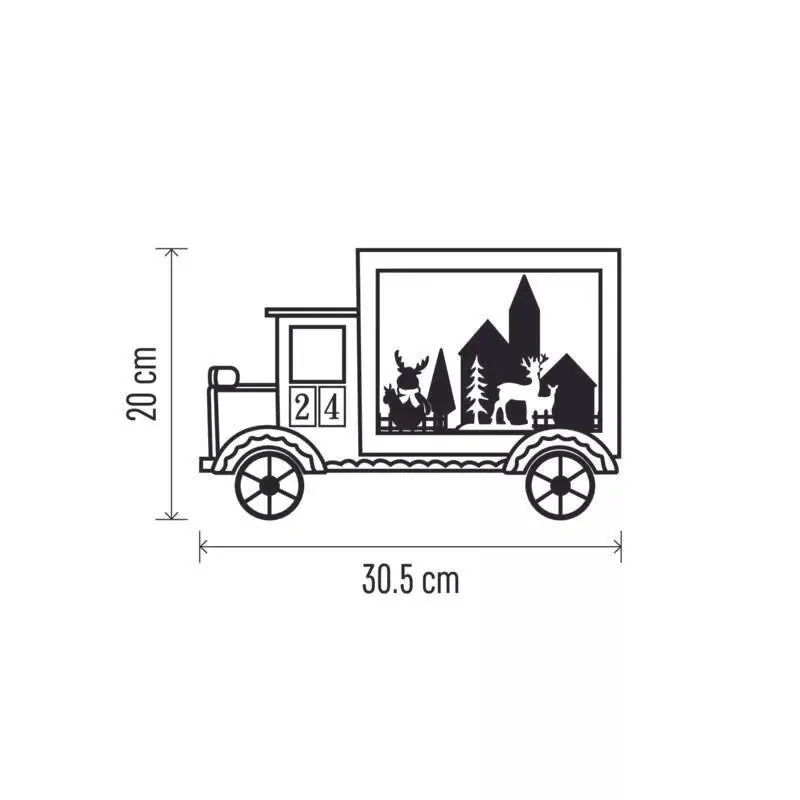 Ozdoba Bożonarodzeniowa w postaci kalendarza adwentowego marki EMOS jest w kształcie świątecznego samochodu. Prezentowany kalendarz adwentowy wyposażony został w 12 diod LED, które świecą ciepłym białym światłem, a ich szacowany czas działania to około 10000h. Produkt wykonany został z wysokiej jakości drewnianego materiału i zasilany jest dwiema bateriami AA. Kalendarz adwentowy będzie również trafionym prezentem na Mikołaja. Wymiary dekoracji świątecznej to: szerokość- 30,5cm, wysokość- 20cm. Produkt objęty gwarancją producenta.