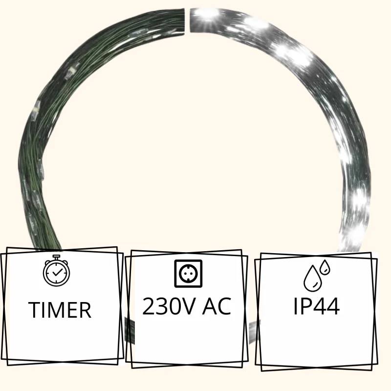 Lampki wyposażone są w praktyczny TIMER, który automatycznie włącza i wyłącza diody o określonych porach, co zwiększa wygodę użytkowania i pozwala oszczędzać energię. Długi, pięciometrowy przewód zapewnia dużą elastyczność w rozmieszczaniu dekoracji, a metalowy, zielony drucik idealnie wtapia się w tło choinki, nie odwracając uwagi od blasku samych diod. Taka konstrukcja czyni lampki nie tylko eleganckimi, ale też odpornymi na codzienne użytkowanie.
