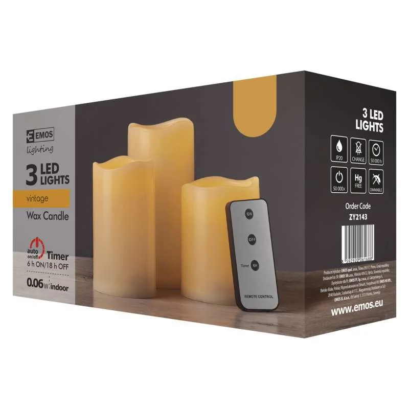 Świąteczna dekoracja marki EMOS w postaci trzech okrągłych świeczek załączanych pilotem. Do zasilenia całego zestawu potrzeba dziewięciu baterii AAA- brak w zestawie. Świeczki LED w komplecie posiadają pilot, za pomocą, którego możesz je włączać, wyłączać lub uruchomić wyłącznik czasowy tzw. timer. Prezentowana świąteczna dekoracja LED przystosowana została tylko do użytku wewnętrznego, a jej stopień odporności to IP20. Każda świeczka (3szt.) posiada po jednej diodzie LED, a jej przybliżony czas żywotności to około 10 000h. Średnica świeczek to 7,5 cm a ich wysokości to 10;12,5 i 15 cm.