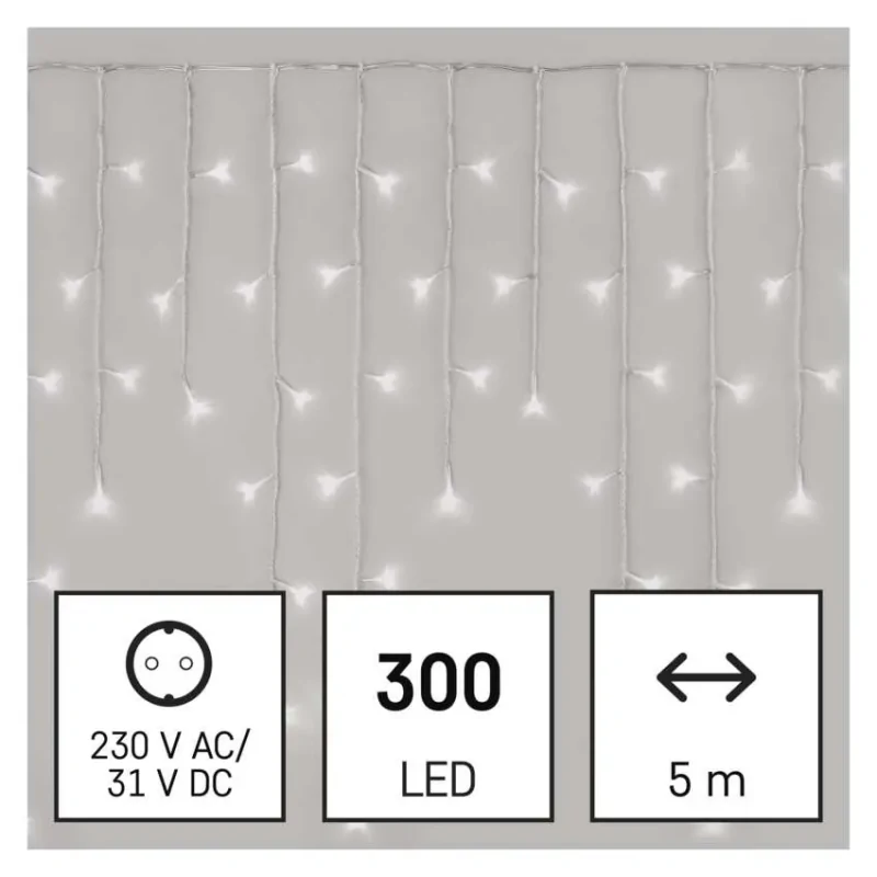 Łańcuchy świąteczne D4CC02 CLASSIC marki EMOS, wielofunkcyjne stalaktyty (sople) to jedno z "dwuwymiarowych" rozwiązań oświetleniowych. Lampki dekoracyjne pozwalają na wybór jednego z ośmiu zaprogramowanych trybów światła, które następnie rozjaśniają każdą przestrzeń i przyjemnie wpływają na dzieci i dorosłych. Tryb podstawowy sprawia, że wszystkie światła są włączone na stałe, natomiast pozostałe siedem trybów to kombinacja różnych sposobów migania, wyłączania i włączania świateł. Praktyczna funkcja timera, może rozświetlać drzewko w regularnych odstępach czasu i nie trzeba się martwić o ich włączanie i wyłączanie. Możesz dekorować schody, balustrady, umieścić lampki w oknach lub powiesić je na balkonach. Światełka wielofunkcyjne są odporne na wilgoć, dzięki ochronie IP44 i odpowiednie dla wszystkich dekoracji wewnętrznych i zewnętrznych. Kurtyna świetlna mierzy 5 metrów długości, dzięki czemu oświetli dużą przestrzeń. Lampki świecą zimną barwą światła, o mocy 6W. Łańcuch dostępny jest o różnych wymiarach i barwie świecenia.