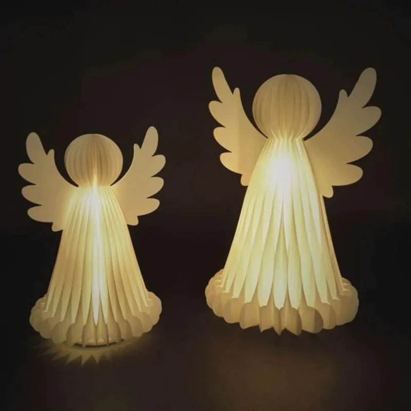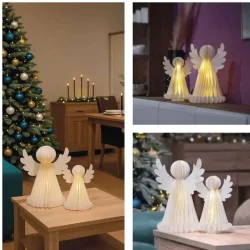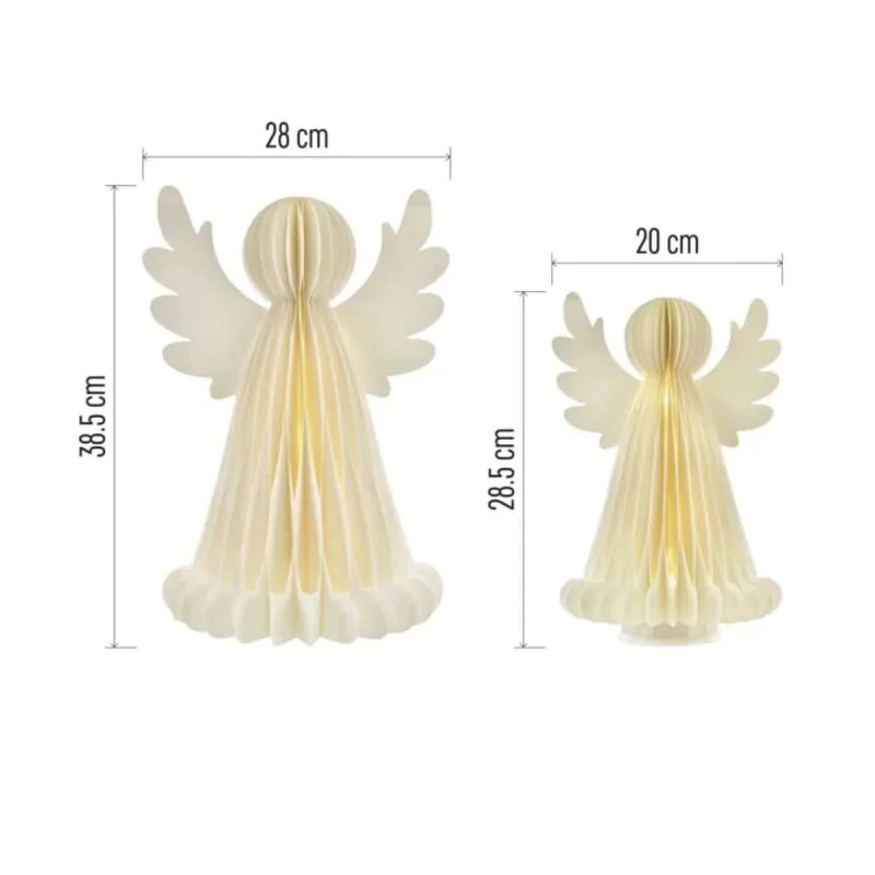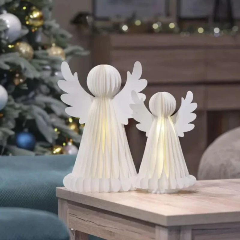 Wprowadź wyjątkową magię Bożego Narodzenia do swojego domu dzięki eleganckiemu zestawowi dwóch aniołów wykonanych z eleganckiego, składanego papieru i wyposażonych w ciepłe, białe oświetlenie LED. To subtelna i stylowa dekoracja, która zachwyca zarówno efektownym wyglądem, jak i niezwykle prostym montażem – wszystko dzięki mocnym magnesom utrzymującym formę.