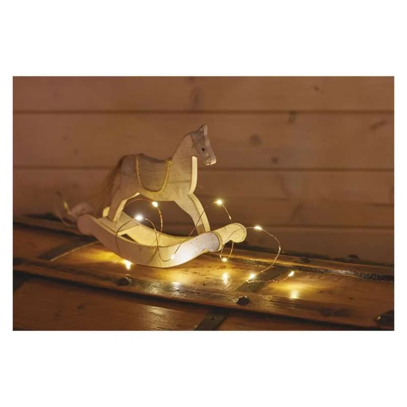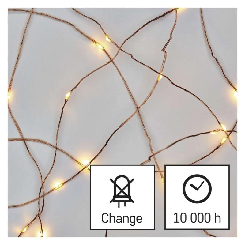 Delikatna linka oświetleniowa D3AW06 marki EMOS, świetnie sprawdzi się jako dodatkowa dekoracja np. aranżacji świątecznych. Długość światełek wynosi 90cm, a odstęp między diodami LED to 10cm. Całość wykonana jest z metalu w kolorze miedzianym. Łańcuch zasilany jest dwiema bateriami AA i emituje ciepła barwą światła. Dodatkowo dekoracja świetlna LED posiada wbudowane TIMER oraz przewód zasilający, który mierzy 30cm. Produkt objęty jest gwarancją producenta.