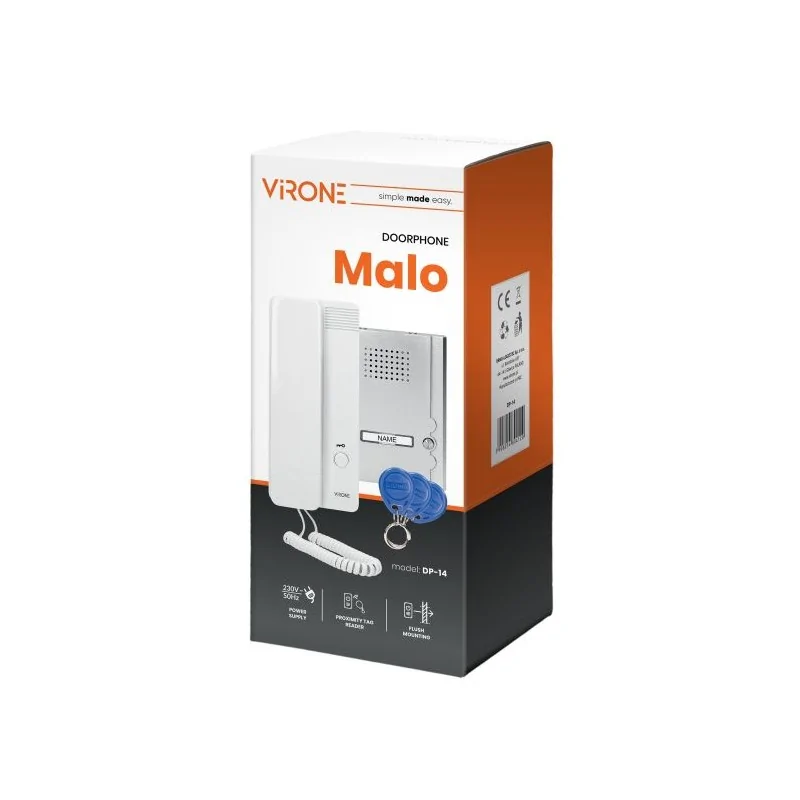 Zestaw domofonowy jednorodzinny MALO marki ORNO, o montażu podtynkowy, posiada aluminiową obudowę kasety. Również wyposażone jest na miejsce na nazwisko. Otwieranie rygla za pomocą breloka zbliżeniowego, unifon posiada wbudowany zasilacz i przewód zasilający, elektrozaczep nie wymaga dodatkowego zasilania. Produkty objęty gwarancją producenta.
