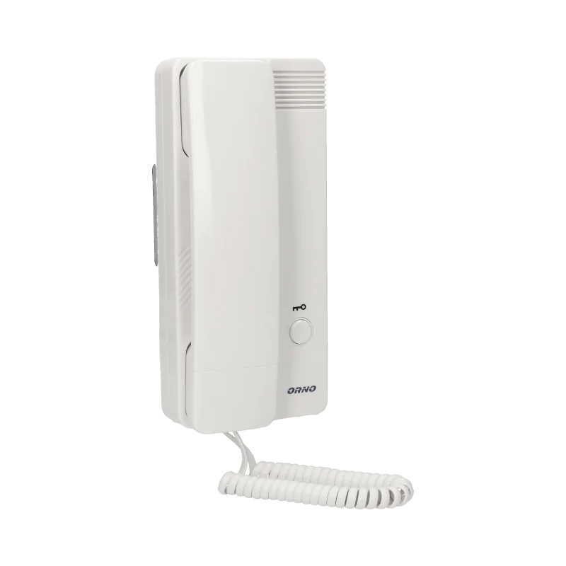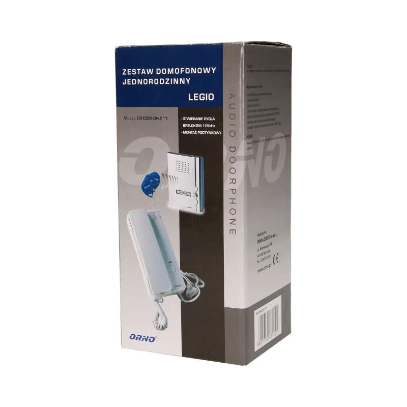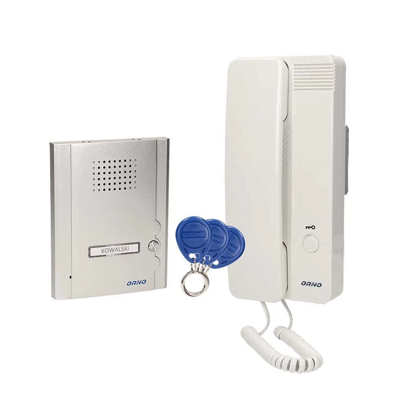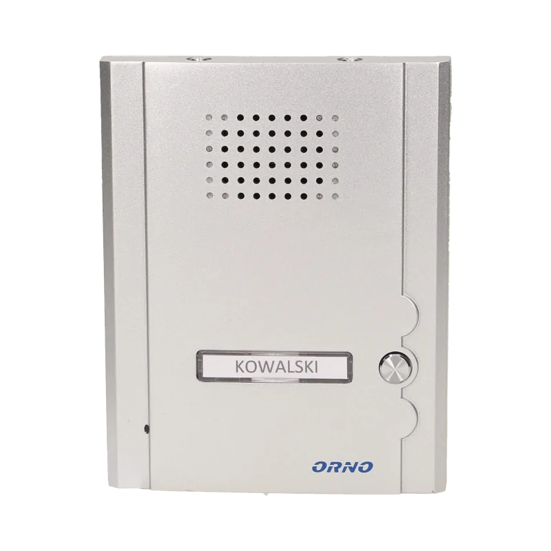 Domofon jednorodzinny przeznaczony do montażu podtynkowego marki Orno posiada miejsce na nazwisko. Unifon wyposażony jest w wbudowany zasilacz oraz przewód zasilający. Zasilanie elektrozaczepu odbywa się z domofonu. Unifon to klasyczna, biała słuchawka. Panel zewnętrzny wyposażony jest w czytnik kart i breloków zbliżeniowych pozwalając tym samym na samodzielne otwieranie zamka. Produnkt objęty jest 2-letnią gwarancją producenta.