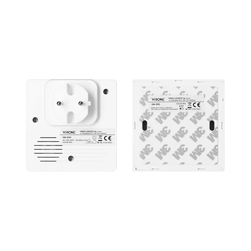 Niewielki dzwonek bezprzewodowy do drzwi VIRONE firmy ORNO to urządzenie, które doskonale spisze się w każdym miejscu. Zestaw składa się z odbiornika oraz nadajnika. Produkt wyposażony został w wodoodporny przycisk (IPX7) zasilany z przetwornika elektromechanicznego niewymagający baterii. Biały dzwonek bezprzewodowy posiada zasięg do 100m w terenie otwartym. Bezprzewodowy dzwonek posiada 3-stopniową regulację głośności dźwięku z możliwością całkowitego wyciszenia. Dodatkowo dzwonek posiada 25 dzwonków polifonicznych do wyboru oraz 2 tryby sygnalizacji (optyczna i dźwiękowa). Dużym atutem dzwonków bezprzewodowych jest to, że nie wymagają one instalacji dzwonkowej.