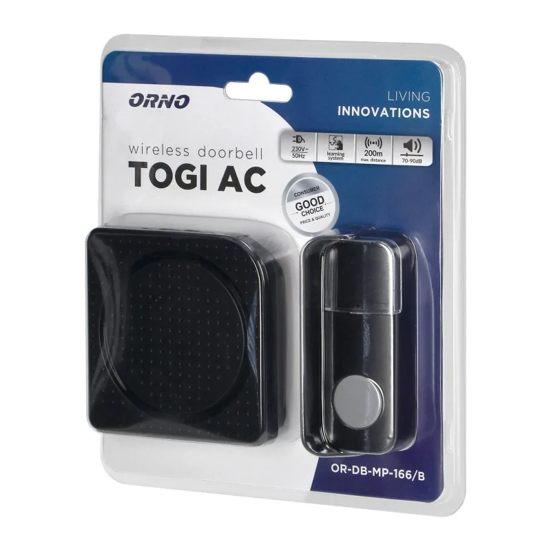 Kompaktowy dzwonek bezprzewodowy sieciowy TOGI marki ORNO to urządzenie alarmowe, które doskonale spisze się w budynkach mieszkalnych, jak i firmowych. Dodatkowo dzwonek wyposażony został w przycisk z wizytówką, na którym możesz umieścić nazwisko lub nazwę firmy. Produkt posiada 38 dźwięków dzwonka, a jego maksymalny zasięg to 200m w terenie otwartym. Atutem prezentowanego dzwonka bezprzewodowego jest 4-stopniowa regulacja głośności dzwonka na poziomie 70-90dB. Dodatkowo liczbę odbiorników oraz przycisków można zwiększać w miarę potrzeb. Dzwonek zasilany jest sieciowo, natomiast przycisk baterią CR2032- w zestawie.
