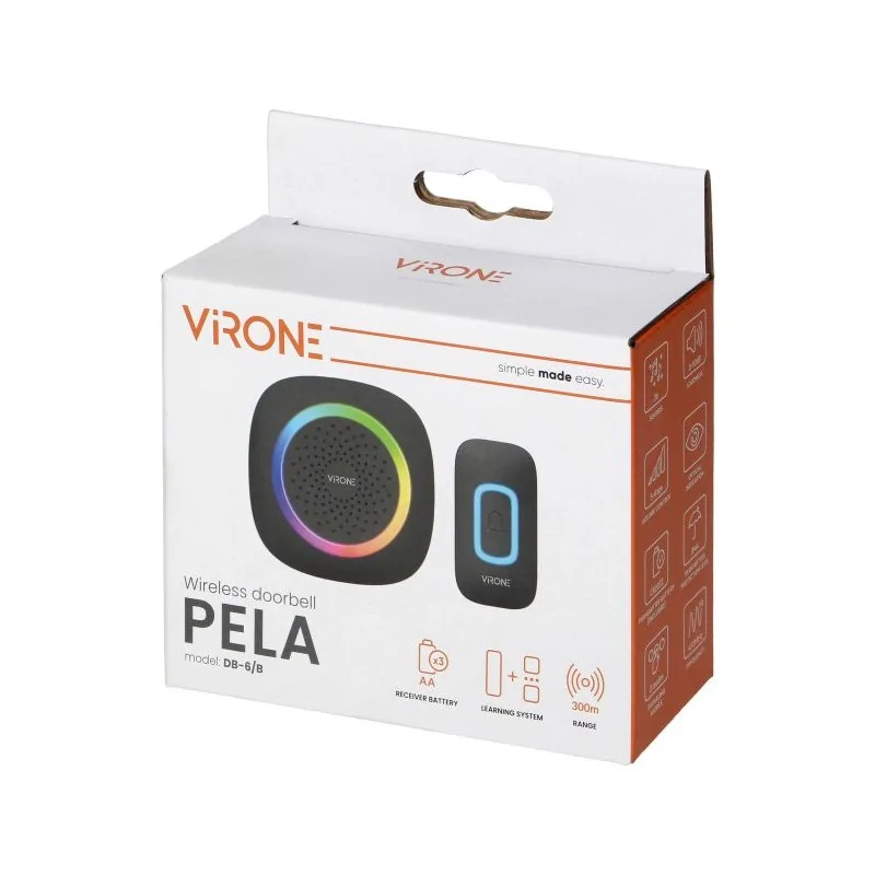 Bezprzewodowy dzwonek do drzwi będzie doskonałym rozwiązaniem w każdym domu czy biurze. Dodatkowo czarny dzwonek wyposażony jest w regulację głośności z możliwością całkowitego wyciszenia oraz 60 dźwięków ( w tym np. melodie świąteczne). Atutem prezentowanego dzwonka jest również wbudowana sygnalizacja optyczna w postaci kolorowych diod led RGB, które świecą przy naciśnięciu przycisku. Wysoki stopień odporności IP44 nadajnika gwarantuje odporność na trudne warunki atmosferyczne. Dzwonek bezprzewodowy bateryjny PELA w kolorze czarnym, dzięki funkcji learning system można rozbudowywać o kolejne nadajniki, montując je przy kilku wejściach, zapewniając wygodę w życiu codziennym.