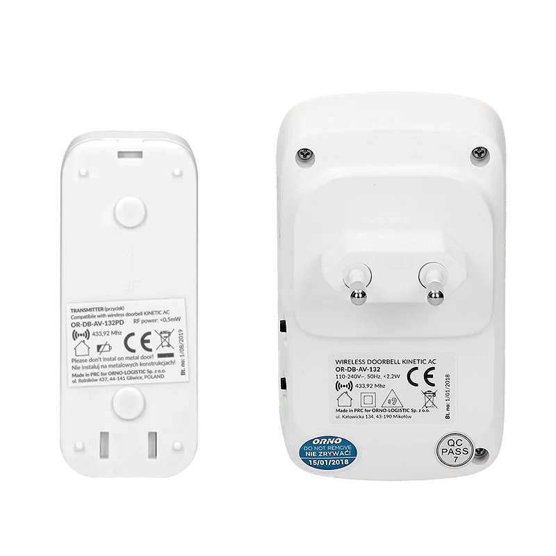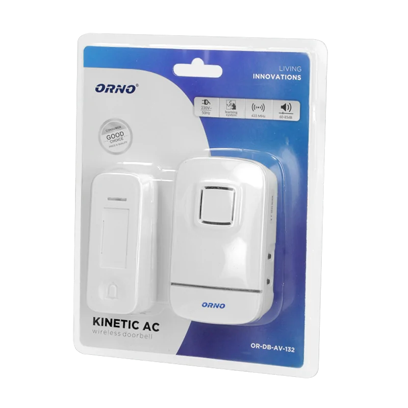 Bezprzewodowy dzwonek marki ORNO o zasięgu działania w terenie otwartym 70 m posiada 32 dźwięki dzwonka do wyboru. Odbiornik zasilany sieciowo posiada możliwość regulacji głośności w zakresie 60-85 dB. Nadajnik zasilany z przetwornika mechanicznego odporny jest na bryzgi wody oraz wnikanie pyłów z otoczenia. Istnieje możliwość rozbudowy dzwonka o dodatkowe przyciski. Urządzenie nie wymaga instalacji dzwonkowej. Produkt objęty 3-letnią gwarancją producenta.