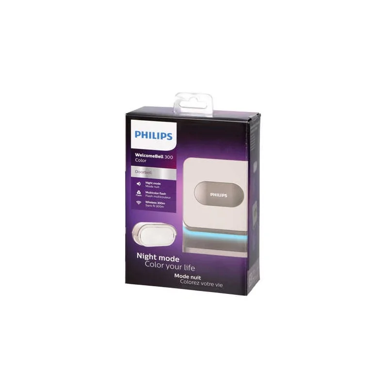 Bezprzewodowy dzwonek do drzwi Philips WelcomeBell Color firmy Orno będzie doskonałym rozwiązaniem w każdym domu czy biurze. Produkt jest niewielkich wymiarów, dzięki czemu nie zajmie dużo miejsca. Dodatkowo dzwonek wyposażony jest w regulację głośności z możliwością całkowitego wyciszenia. Atutem prezentowanego dzwonka jest również wbudowana sygnalizacja optyczna w postaci kolorowych diod led (6 kolorów do wyboru), które świecą przy każdorazowym naciśnięciu przycisku. Wysoki stopień odporności IP65 nadajnika gwarantuje odporność na trudne warunki atmosferyczne, Dodatkowe cechy dzwonka: przycisk włączania trybu nocnego, sygnalizacja zużycia baterii, zakres działania do 300m w terenie otwartym, podświetlany przycisk wejścia z miejscem na nazwisko.
