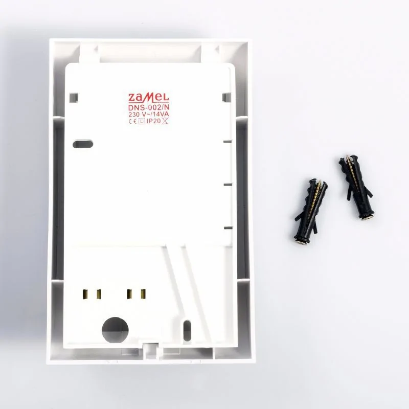 Dzwonek Zamel elektromechaniczny przewodowy, model KOMPAKT DNS-002/N idealnie nadaje się do zawieszenia w przedpokoju, gdzie znajduje się instalacja dzwonkowa o napięciu 230 V AC. Wymiary tego kompaktowego dzwonka przewodowego to 98 x 160 x 43 milimetry. Posiada stalową czaszę, o średnicy 76 mm zamkniętą w stylowej obudowie z tworzywa sztucznego przyozdobionej charakterystycznymi żłobieniami. Regulacji głośności można dokonywać poprzez obrót czaszy dzwonka. Głośność dźwięku to 80 decybeli, co w zupełności wystarcza w warunkach domowych. Idealny jako dzwonek do drzwi sklepu czy mieszkania.