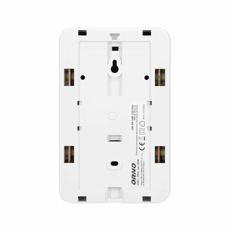 Dzwonek dwutonowy OR-DP-MR-150/PW BREVIS Mini AC, to prosty w montażu i wygodny w użyciu dzwonek elektromechaniczny z funkcją przeciw-blokady łącznika. Przeznaczony do zastosowania w pomieszczeniach zamkniętych z instalacją dzwonkową prądu zmiennego 230V, np. w domu, mieszkaniu, sklepie, itd. Jest to produkt marki ORNO, w który głośność wynosi 80dB. Produkt objęty jest trzyletnią gwarancją producenta.