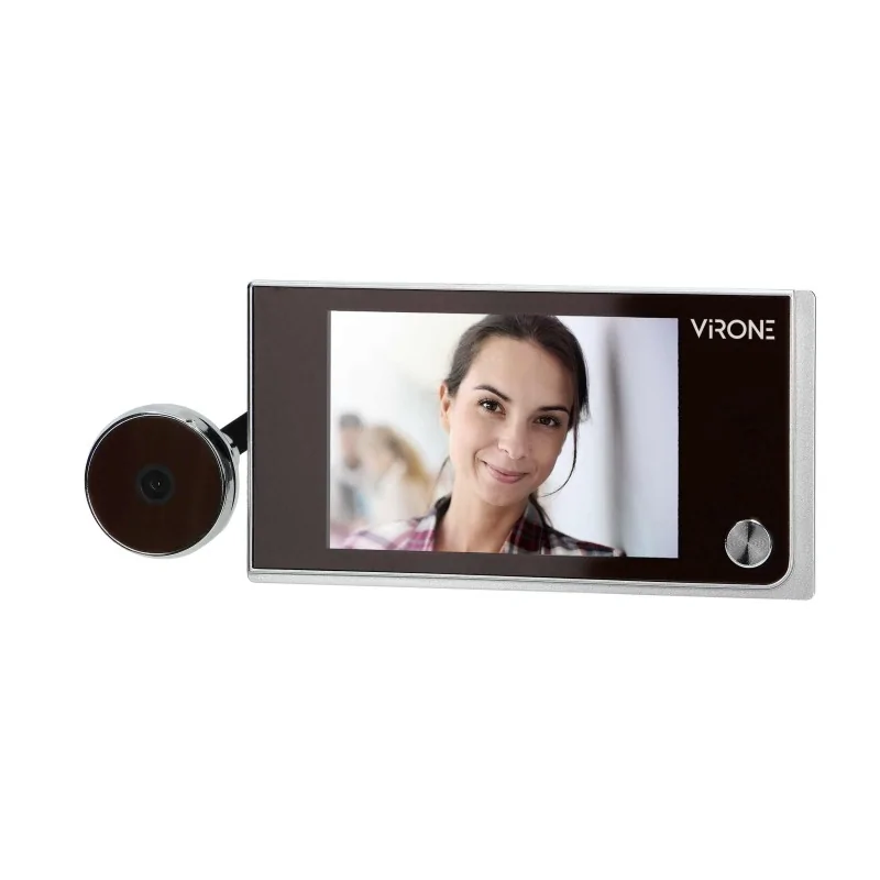 Elektroniczny wizjer do drzwi VIRONE DV-1 pozwala na podgląd osoby stojącej bezpośrednio przed drzwiami na ekranie kolorowego wyświetlacza. Dyskretna szerokokątna kamera która jest przystosowana do montażu w miejsce standardowych wizjerów optycznych o otworze o średnicy 14mm - 30mm oraz grubości drzwi między 5-100mm. Urządzenie jest niezwykle proste w obsłudze i przyda się szczególnie osobom starszym, niskim oraz o słabszym wzroku. Urządzenie zasilane jest czterema bateriami AAA - brak w zestawie.