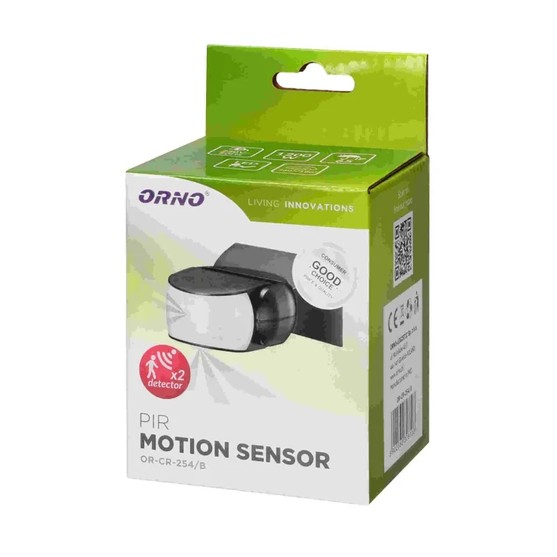 Czujnik ruchu OR-CR-254/B producenta ORNO, służy do automatycznego sterowania oświetleniem lub innymi urządzeniami elektrycznymi wewnątrz i na zewnątrz. Posiada dwa odrębne czujniki z kątem widzenia: 360° oraz 180° w poziomie. Również posiada potencjometry do regulacji czasu świecenia i czułości natężenia światła. Mechaniczna regulacja pionowa i pozioma. Czujnik współpracuje z oświetleniem LED-owym do mocy max 300W, a w przypadku zwykłego źródła światłą moc to max 1200W. Zasięg detekcji urządzenia wynosi 12m. Ten model dostępny jest w kolorze czarnym i białym. Produkt objęty gwarancją producenta.