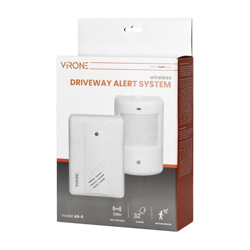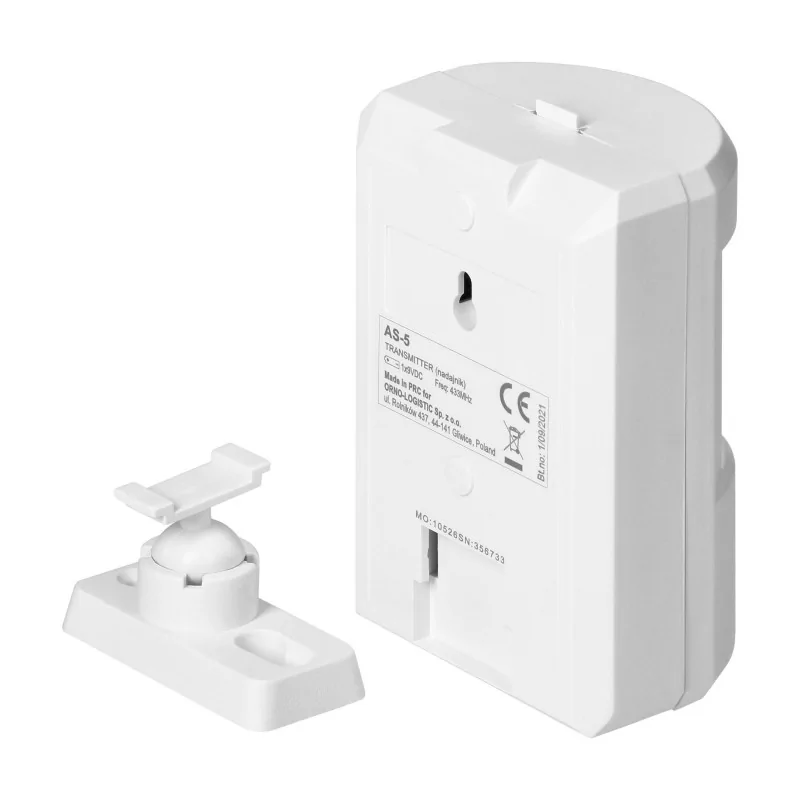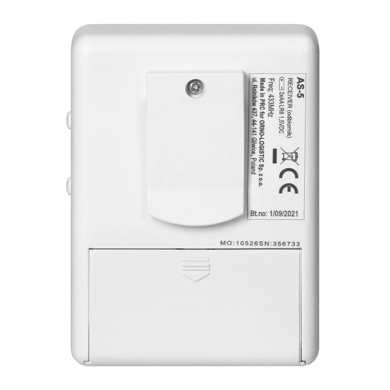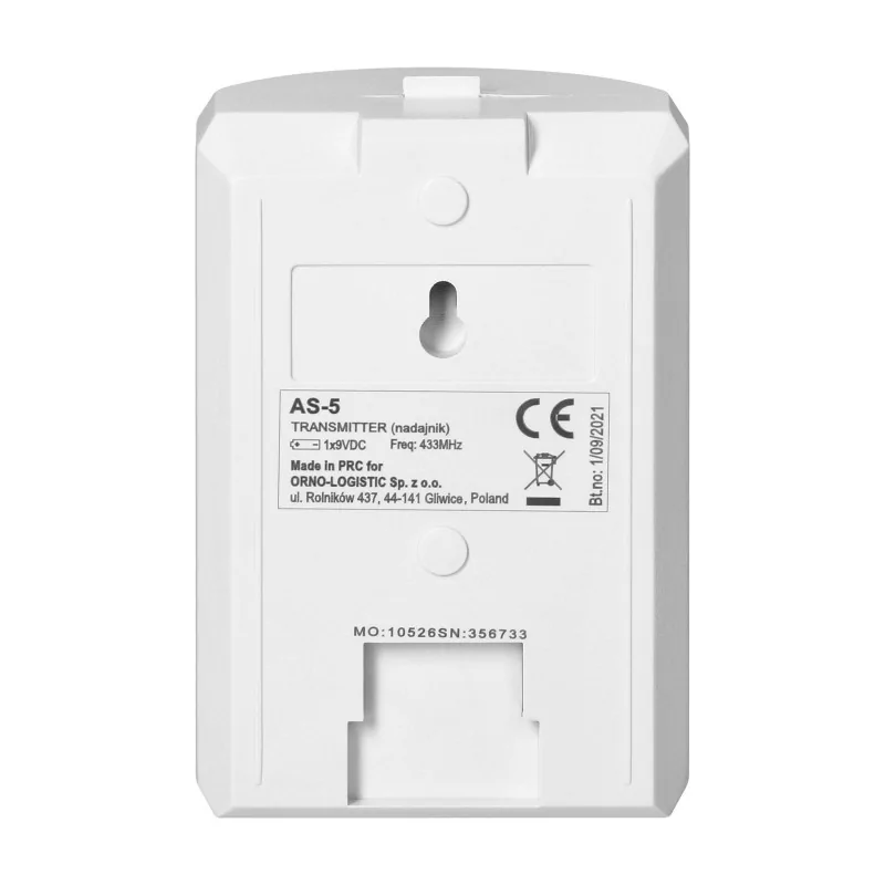 Czujnik ruchu AS-5 marki ORNO, umożliwiający kontrolę drzwi wejściowych, np. w sklepach, pomieszczeniach magazynowych, itp. Urządzenie wysyła powiadomienie na pager (odbiornik), który informuje o wykrytym ruchu jednym z 32 dźwięków dzwonka, wybranym według preferencji użytkownika. Głośność urządzenia można regulować w 3 stopniach. Urządzenie posiada również możliwość całkowitego wyciszenia. Zasięg w terenie otwartym wynosi maksymalnie 100m, a kąt widzenia czujnika w poziomie: ok. 140°.