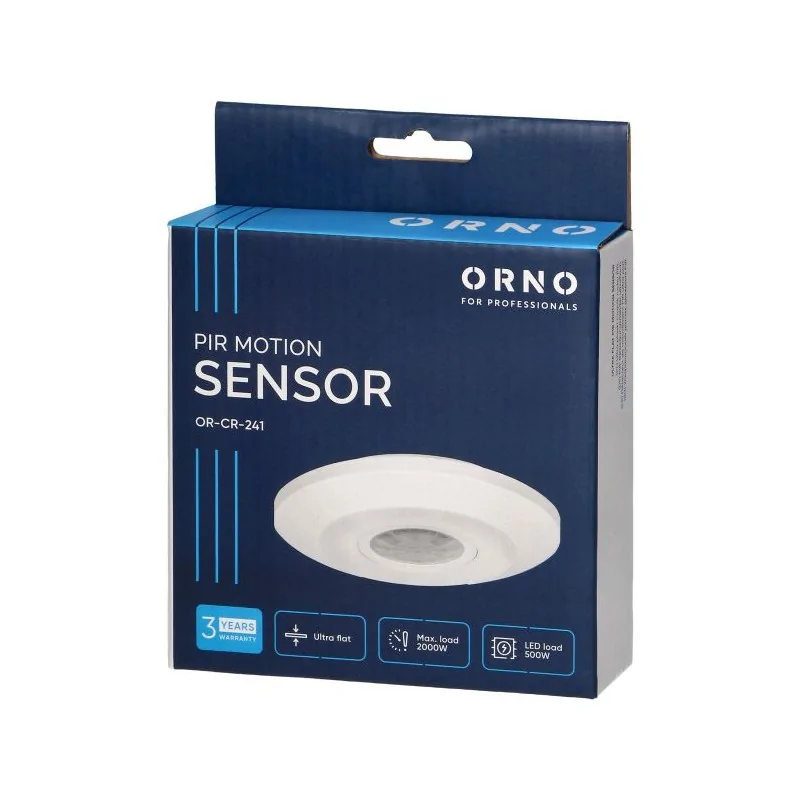 Małogabarytowy czujnik OR-CR-241, może również współpracować z oświetleniem LED, nieprzekraczanym mocy 500W. Służy do automatycznego sterowania oświetleniem lub innymi urządzeniami elektrycznymi. Produkt marki ORNO, wyposażony jest w potencjometry do regulacji: czasu świecenia i czułości natężenia światła. Urządzenie dedykowane jest do użytku wewnątrz pomieszczeń. Zasięg detekcji wynosi 6 metrów. Produkt objęty jest trzyletnią gwarancją producenta. Jego zaletą jest ultra płaska obudowa.