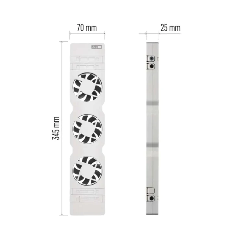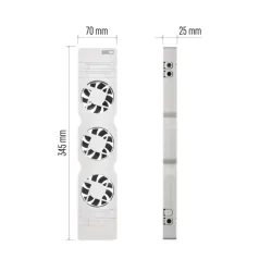 Dzięki niewielkim wymiarom 25 × 70 × 345 mm, wentylator jest łatwy w montażu i doskonale sprawdza się w różnych miejscach, np. na grzejnikach lub w obudowach urządzeń.