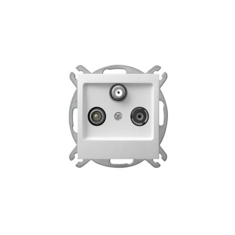 Gniazdo przelotowe antenowe R-TV-SAT w kolorze białym serii IMPRESJA firmy OSPEL, przeznaczone do montażu podtynkowego. Gniazdo wymaga dokupienia ramki serii IMPRESJA firmy OSPEL.