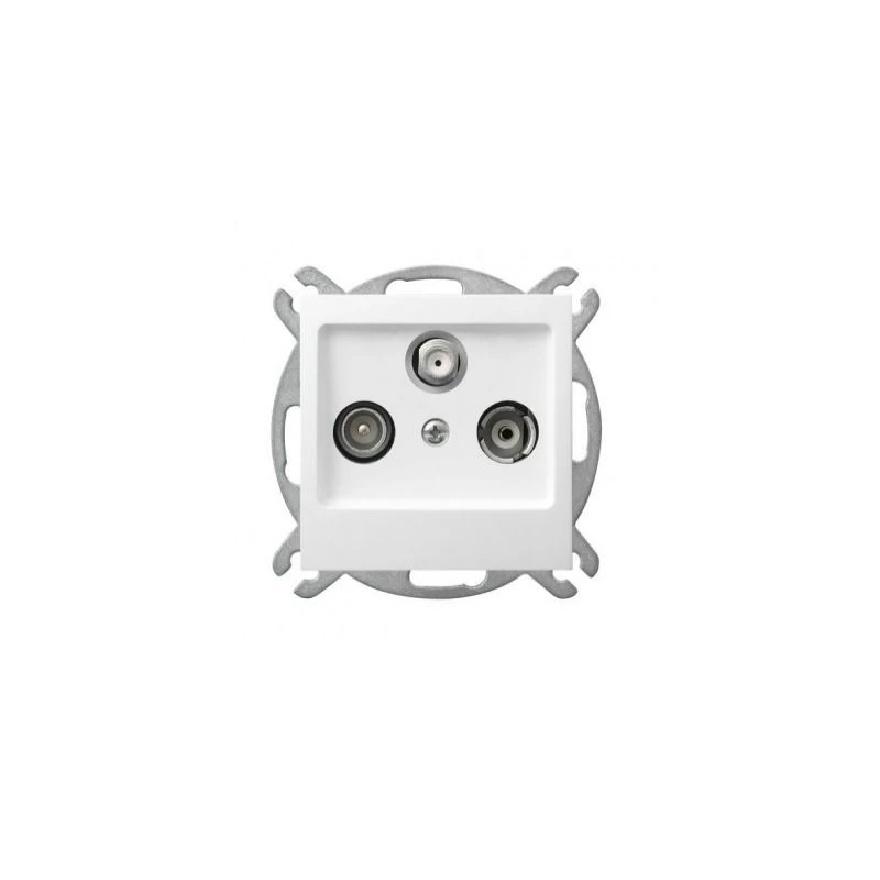 Gniazdo przelotowe RTV-SAT firmy OSPEL z serii AS w kolorze białym, montowane pazurkowo lub gwintowo.