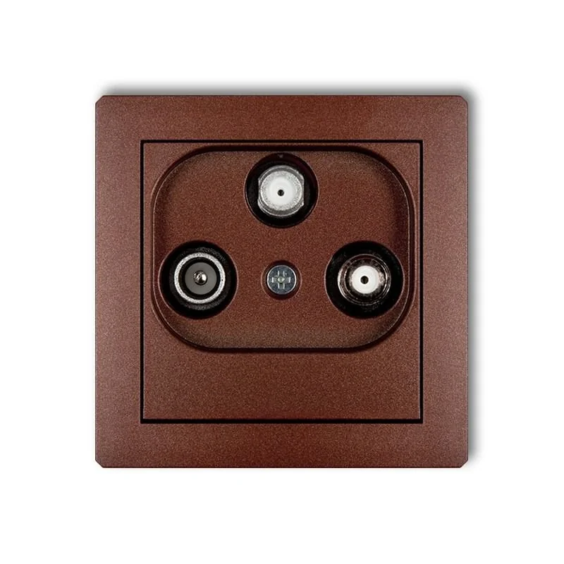 Gniazdo abonenckie w kolorze brązowym z dwoma wyściami SAT+TV serii DECO firmy KARLIK, przeznaczone do montażu podtynkowego. Gniazdo wymaga dokupienia ramki serii DECO firmy KARLIK.