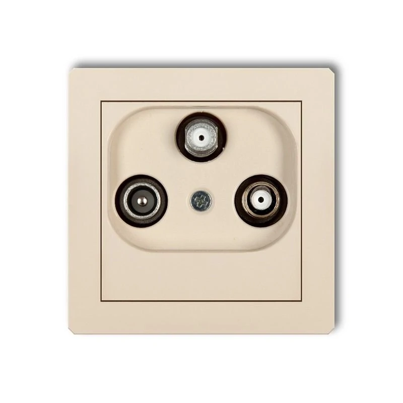 Gniazdo abonenckie z dwoma wyjściami SAT+TV koloru beżowego, przeznaczone do montażu podtynkowego. Gniazdo wymaga dokupienia ramki serii DECO firmy KARLIK.
