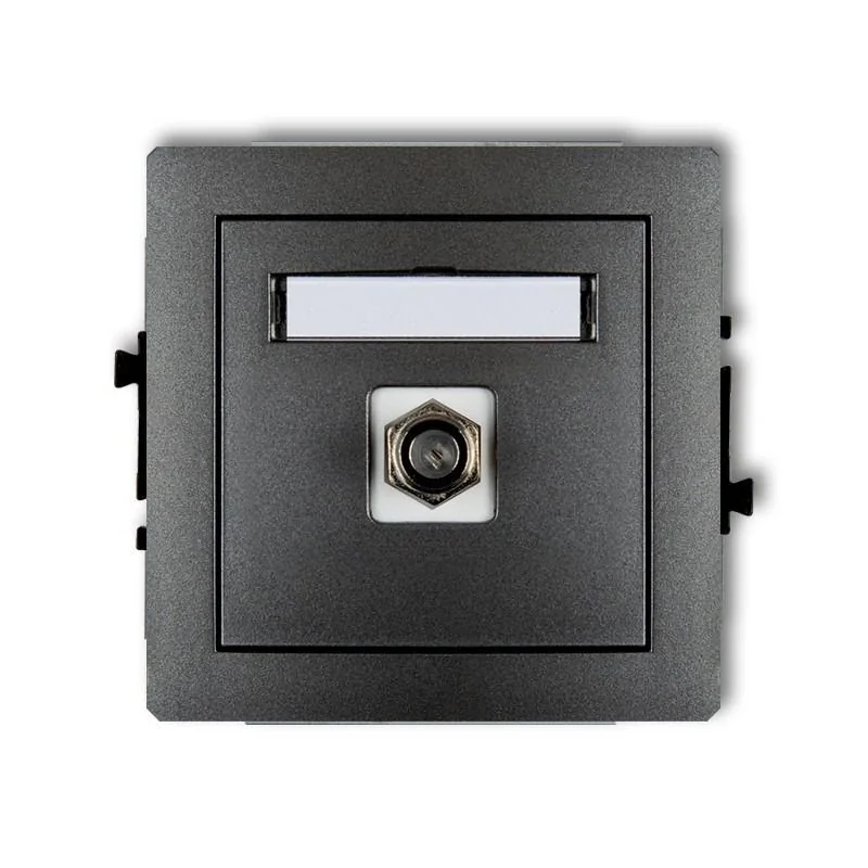 Gniazdo antenowe typu F w kolorze grafitowym serii DECO firmy KARLIK, przeznaczone do montażu podtynkowego. Gniazdo wymaga dokupienia ramki serii DECO firmy KARLIK.