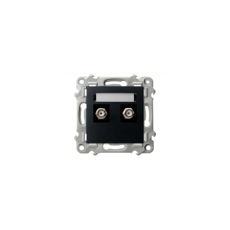 Podwójne gniazdo antenowe typu F w kolorze czarnym, serii SZAFIR firmy OSPEL, przeznaczone do montażu podtynkowego. Gniazdo wymaga dokupienia ramki serii SZAFIR firmy OSPEL.