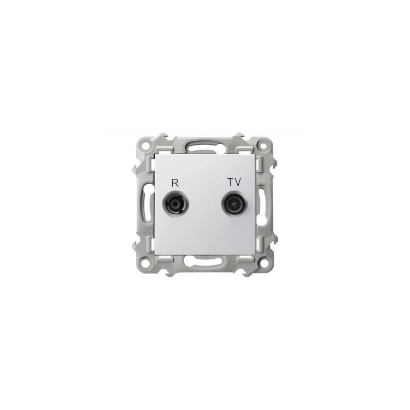 Gniazdo antenowe RTV przelotowe koloru białego serii SZAFIR firmy OSPEL do montażu podtynkowego. Gniazdo wymaga dokupienia ramki serii SZAFIR firmy OSPEL.