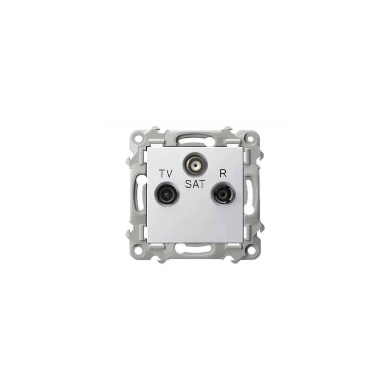 Gniazdo antenowe RTV-SAT końcowe serii SZAFIR marki OSPEL w kolorze białym, przeznaczone jest do montażu podtynkowego. Do prawidłowego montażu należy dokupić ramkę instalacyjną tej samej serii i firmy.