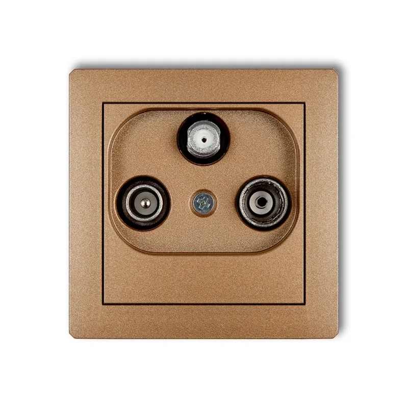 Gniazdo RTV-SAT przelotowe koloru złotego serii DECO firmy KARLIK, przeznaczone do montażu podtynkowego. Gniazdo wymaga dokupienia ramki serii DECO firmy KARLIK.W serii DECO dostępne są ramki w krotnościach 1-5 w różnych kolorach. W ofercie znajdują się również ramki wypełniające- niweluje szczelinę pomiędzy ramką standardową, a ścianą (opcja dodatkowa) oraz pośrednie w bogatej kolorystyce, co pozwala na stworzenie własnej kompozycji.