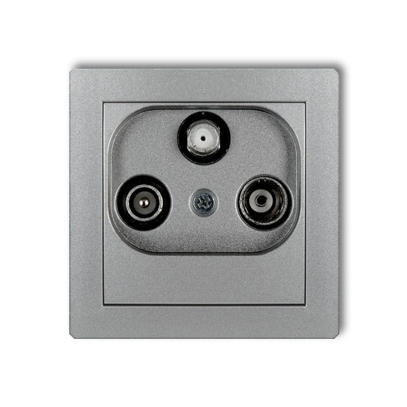 Mechanizm gniazda abonenckiego RTV-SAT serii DECO firmy KARLIK, w kolorze srebrnym, przeznaczony do montażu podtynkowego. Gniazdo wymaga dokupienia ramki serii DECO firmy KARLIK.