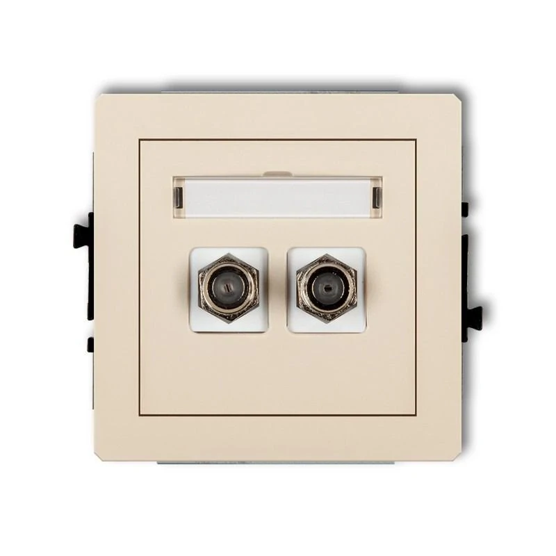 Podwójne gniazdo antenowe typu F (SAT) w koloru beżowego serii DECO firmy KARLIK, przeznaczone do montażu podtynkowego. Gniazdo wymaga dokupienia ramki serii DECO firmy KARLIK.