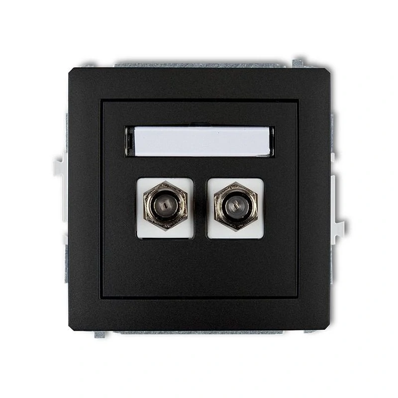 Podwójne gniazdo antenowe typu F (SAT) w kolorze czarnym, pozłacane serii DECO firmy KARLIK, przeznaczone do montażu podtynkowego. Gniazdo wymaga dokupienia ramki serii DECO firmy KARLIK.