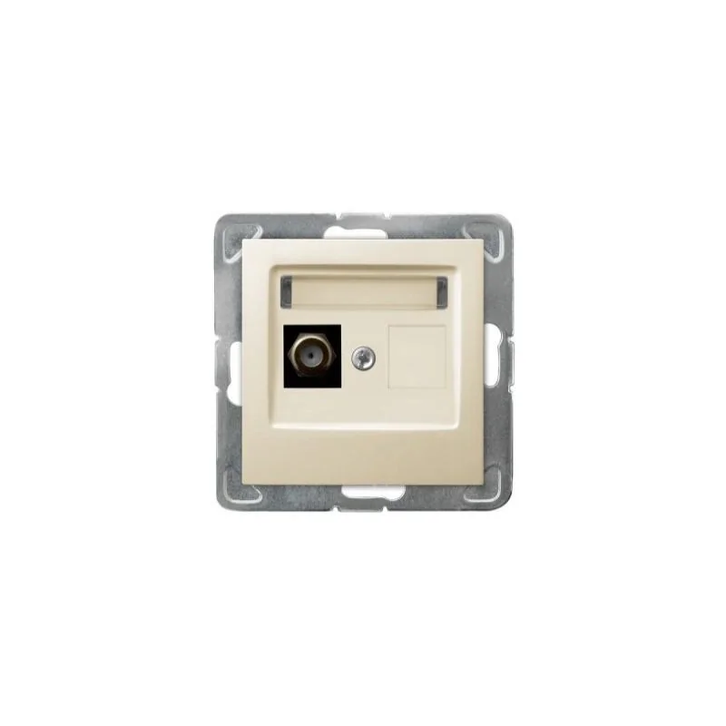 Pojedyncze gniazdo antenowe typu F w kolorze ECRU, serii IMPRESJA firmy OSPEL, sposób montażu: podtynkowy. Gniazdo wymaga dokupienia ramki serii IMPRESJA firmy OSPEL.
