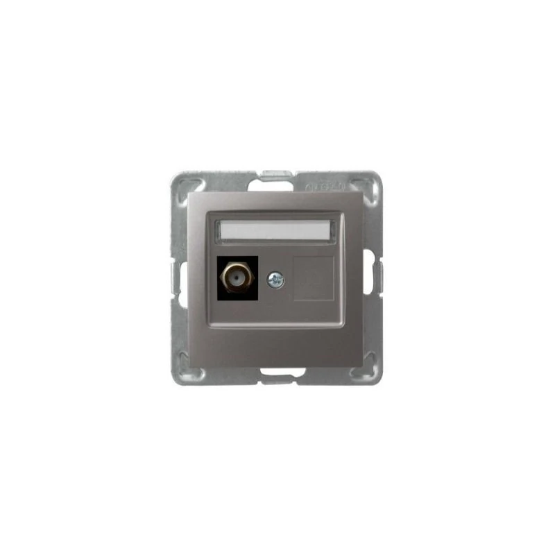 Pojedyncze gniazdo antenowe typu F w kolorze tytanowym serii IMPRESJA firmy OSPEL, przeznaczone do montażu podtynkowego. Gniazdo wymaga dokupienia ramki serii IMPRESJA firmy OSPEL.