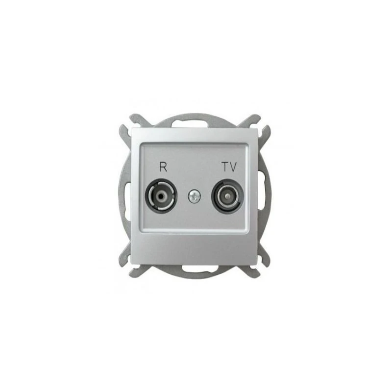Gniazdo antenowe zakończeniowe RTV w kolorze srebrnym serii IMPRESJA firmy OSPEL, przeznaczone do montażu podtynkowego. Gniazdo wymaga dokupienia ramki serii IMPRESJA firmy OSPEL.