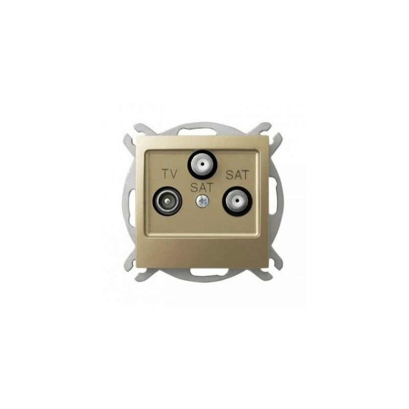 Gniazdo antenowe RTV z dwoma wyjściami SAT w kolorze złotym serii IMPRESJA firmy OSPEL, przeznaczone do montażu podtynkowego. Gniazdo wymaga dokupienia ramki serii IMPRESJA firmy OSPEL.