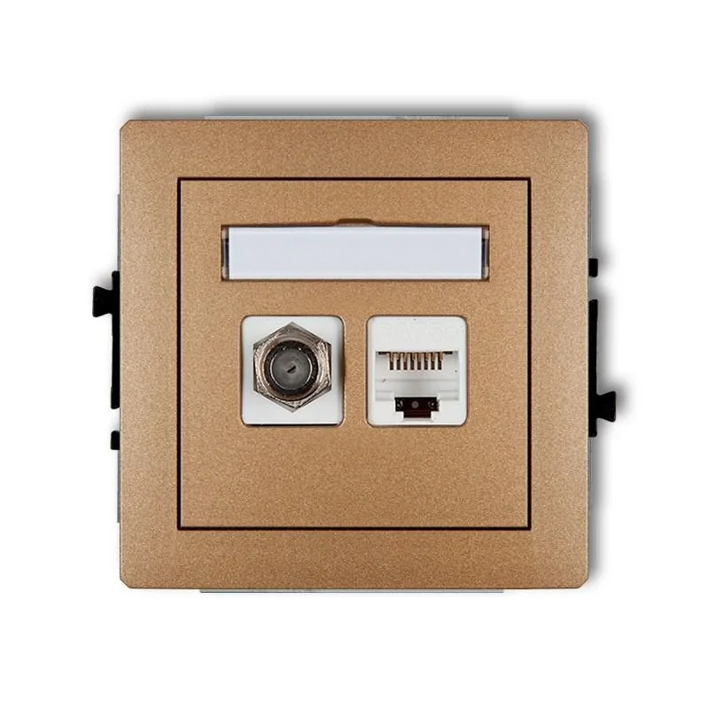 Gniazdo antenowe SAT+komputerowe RJ45 koloru złotego serii DECO firmy KARLIK, przeznaczony do montażu podtynkowego. Gniazdo wymaga dokupienia ramki serii DECO firmy KARLIK.