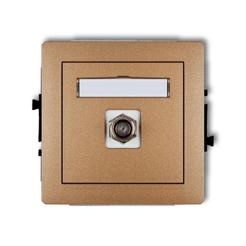 Gniazdo antenowe typu F (SAT) w kolorze złotym serii DECO firmy KARLIK, przeznaczone do montażu podtynkowego. Gniazdo wymaga dokupienia ramki serii DECO firmy KARLIK.